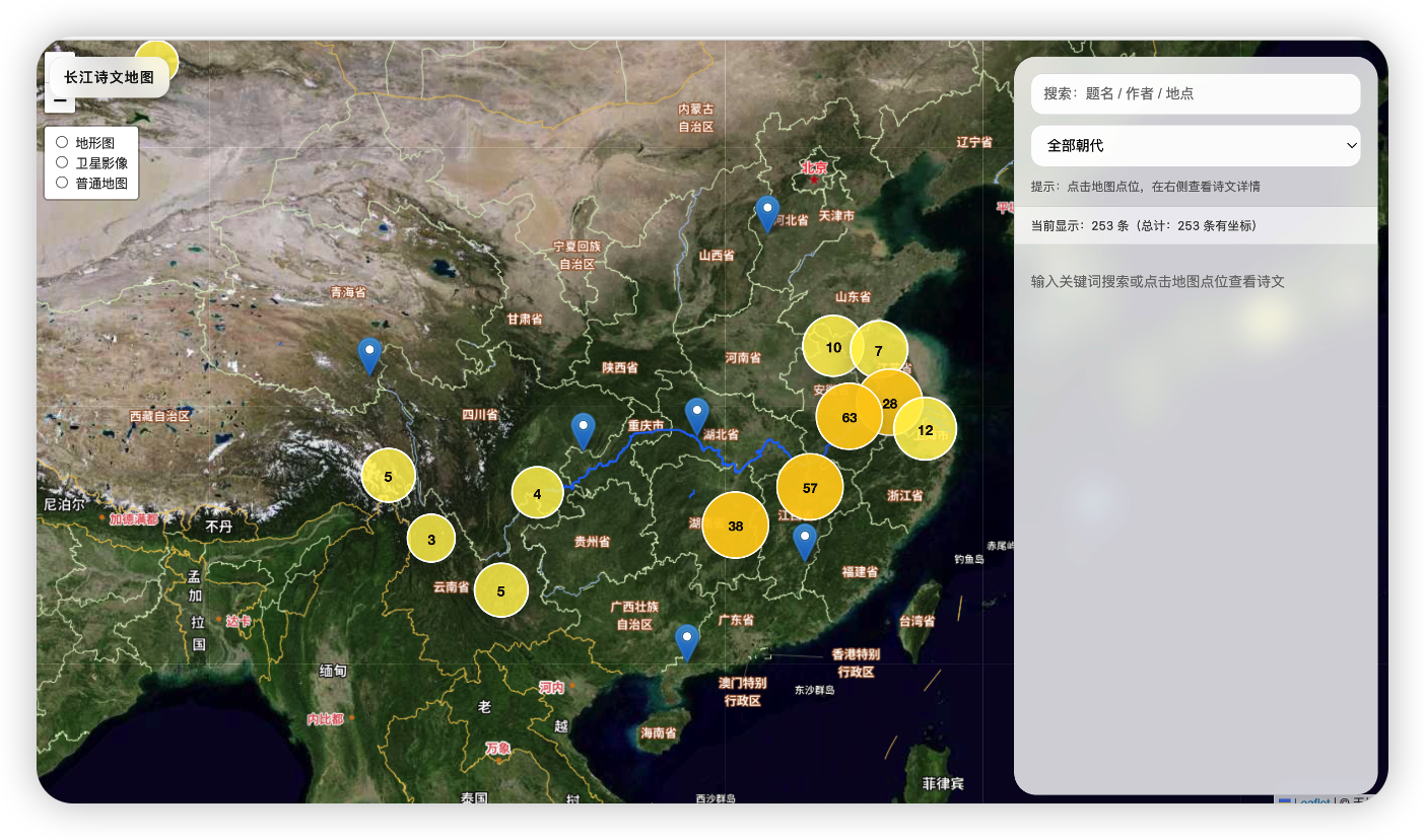 围绕长江流域诗文资源的系统整合与空间化呈现,实验室持续推进 “长江诗文数字地图” 平台建设,完成2715 条结构化数据的整理与构建,初步实现了诗文文本、作者信息与地理空间的精准标注与关联表达,搭建起可视化交互平台(见图:长江诗文数字地图平台界面)。
